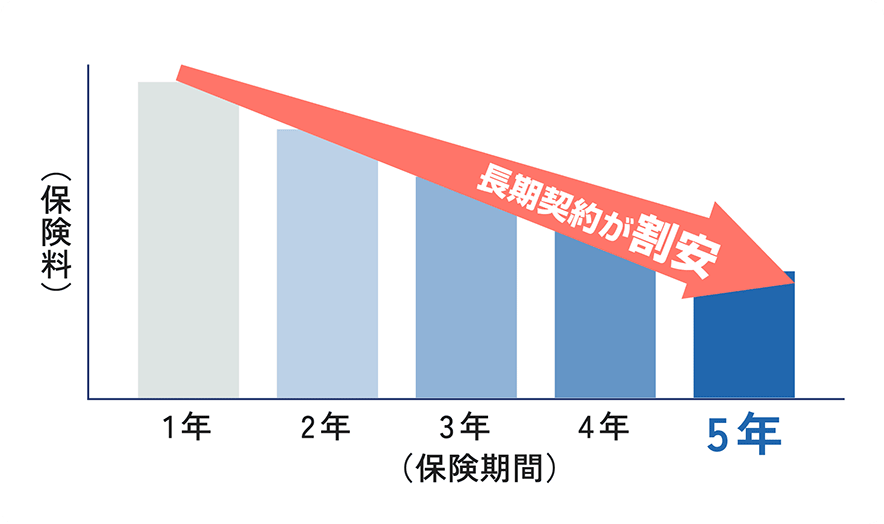 チューリッヒのネット火災保険は、ご契約の期間を1年から5年でお選びいただけます。長い期間でご契約いただく方が、1年あたりの保険料はお安くなります。